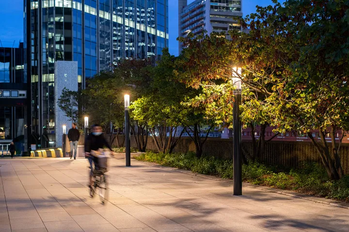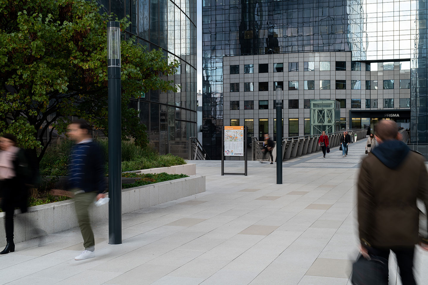 Door na zonsondergang een aangename ervaring te creëren voor zowel de bewoners als de werknemers, heeft de nieuwe verlichting ongetwijfeld bijgedragen tot de heropleving van deze stadswijk. Ze verzekert niet alleen veilige verplaatsingen en een gevoel van welzijn, maar drukt ook het energieverbruik en beschermt het plaatselijke ecosysteem.