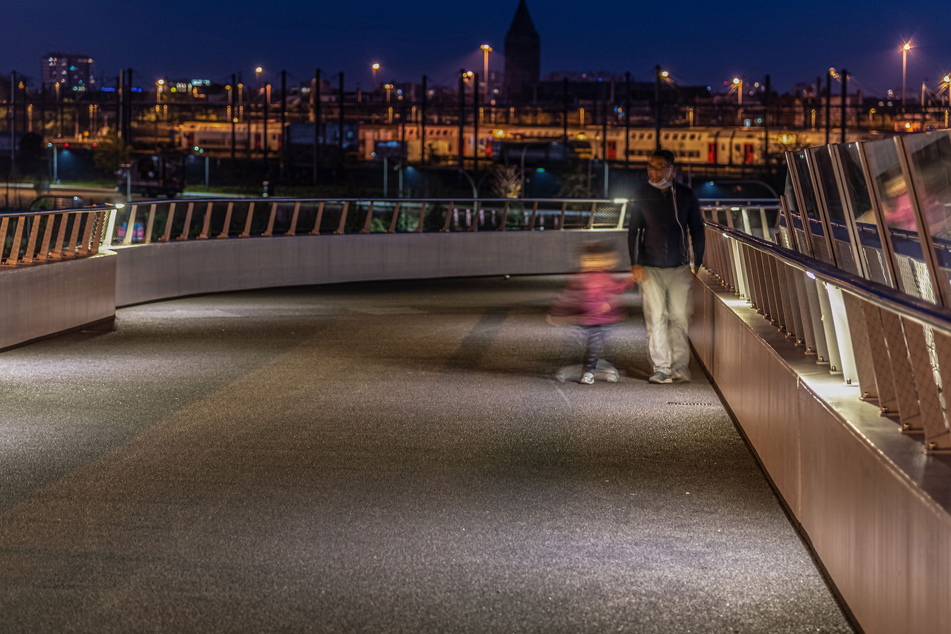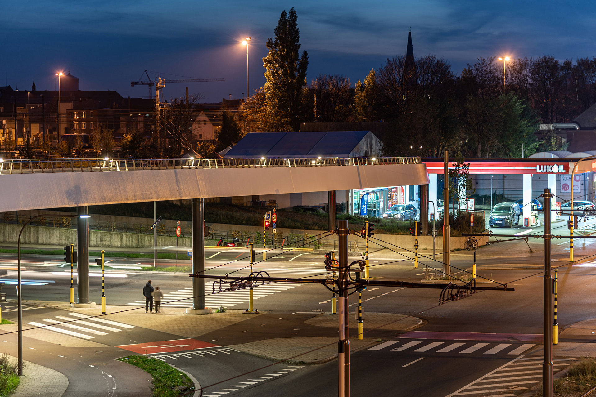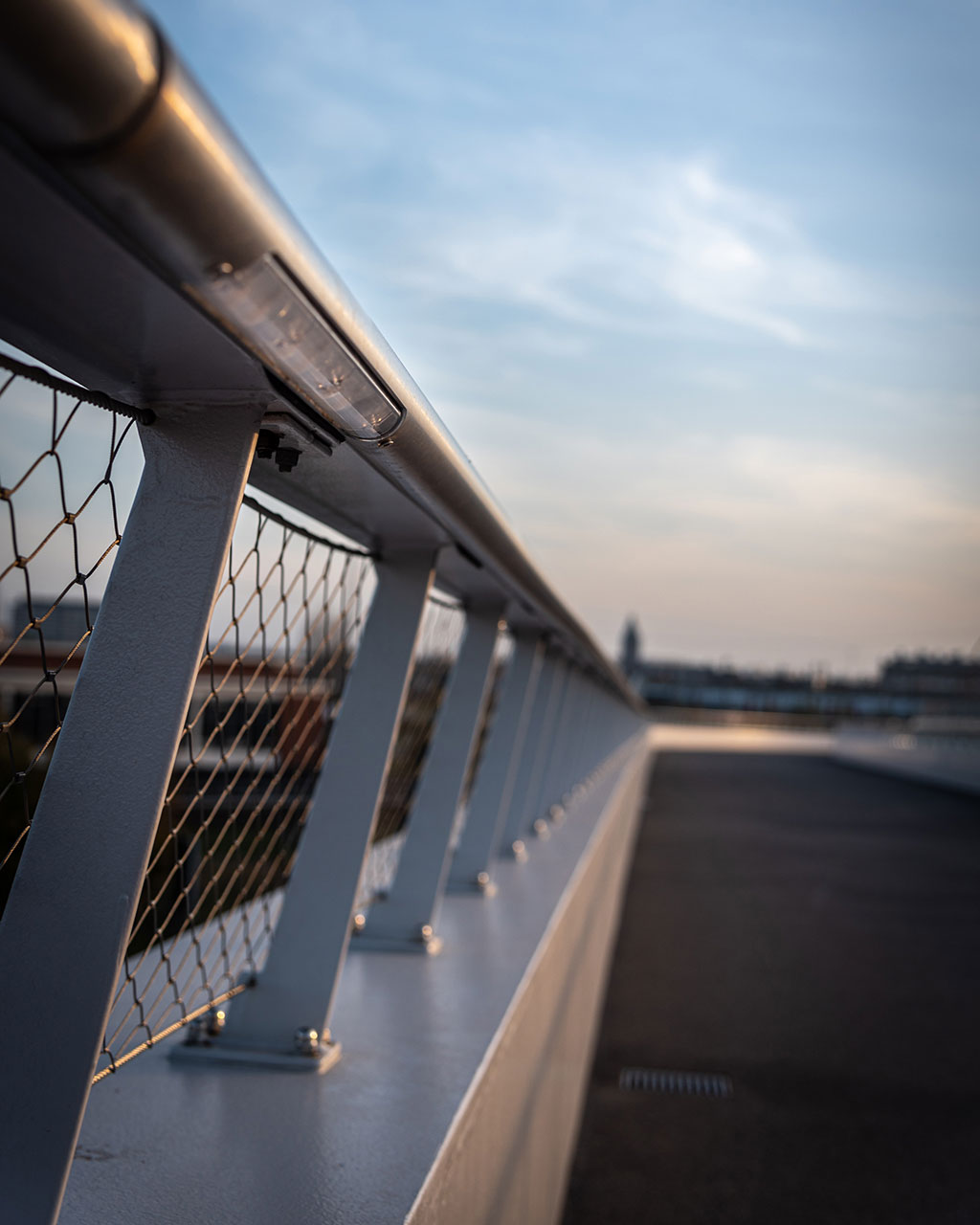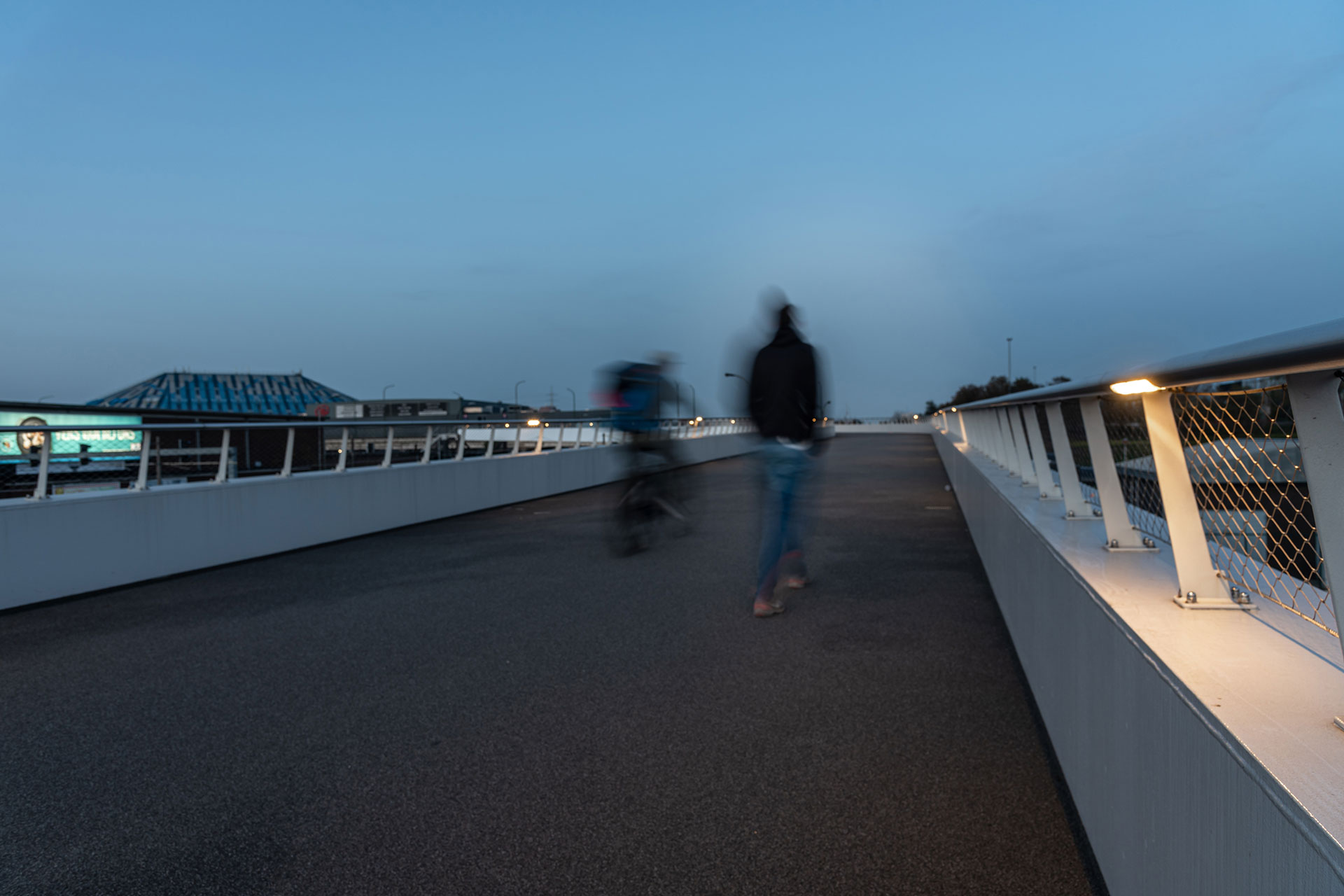 Om optimaal aan die technische en kwaliteitseisen te voldoen, koos de stad Antwerpen voor HANDRAIL uitgerust met LED. 41 armaturen, in de leuning ingebouwd, verlichten de het voet- en fietspad op de brug gelijkmatig zonder de gebruikers te verblinden. Voetgangers en fietsers kunnen de brug zo in alle veiligheid oversteken. Dankzij die integratie zijn de armaturen overdag onzichtbaar. 's Nachts helpen ze om de moderne architectuur van het kunstwerk te benadrukken. Om het wegdek onder de brug te verlichten, viel de keuze op 18 SCULPLINE armaturen dankzij de vlotte integratie in de afwerking onder het brugdek.