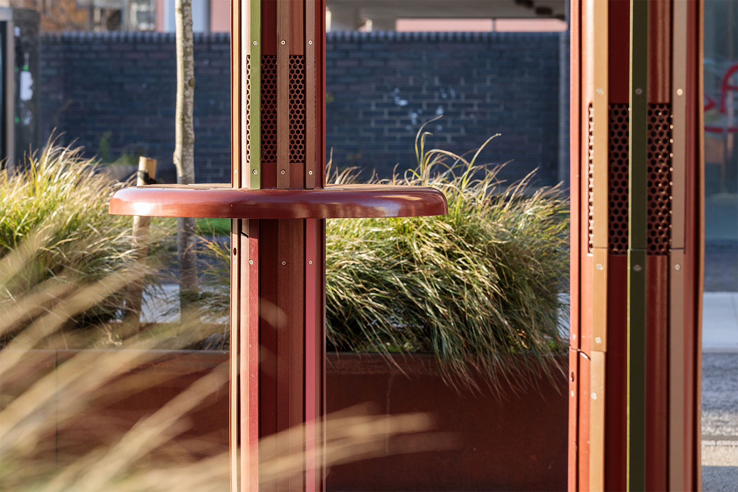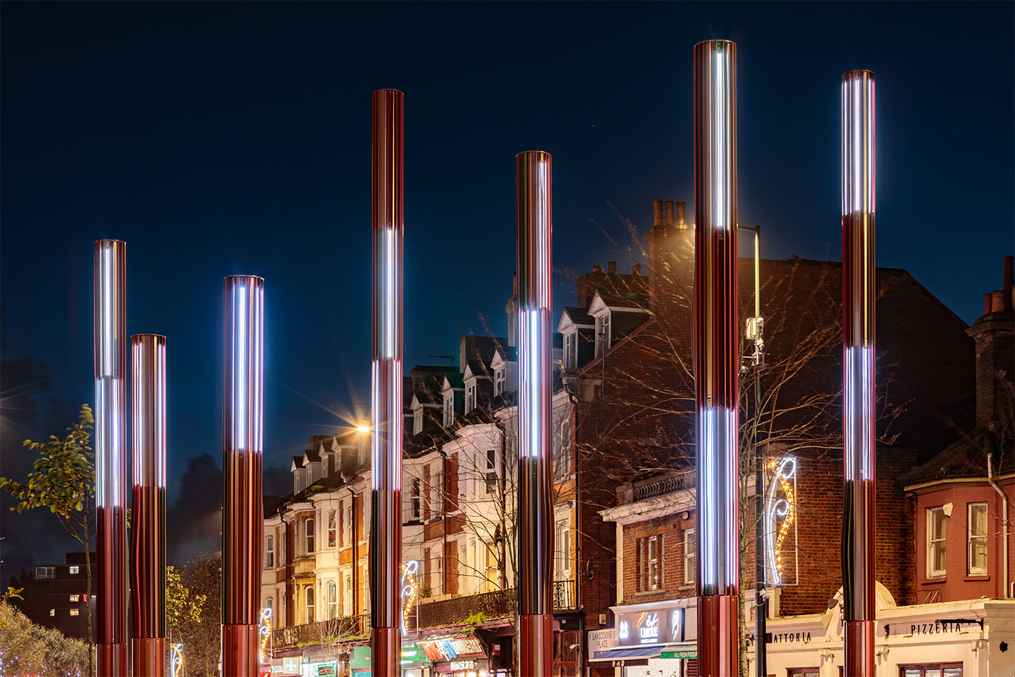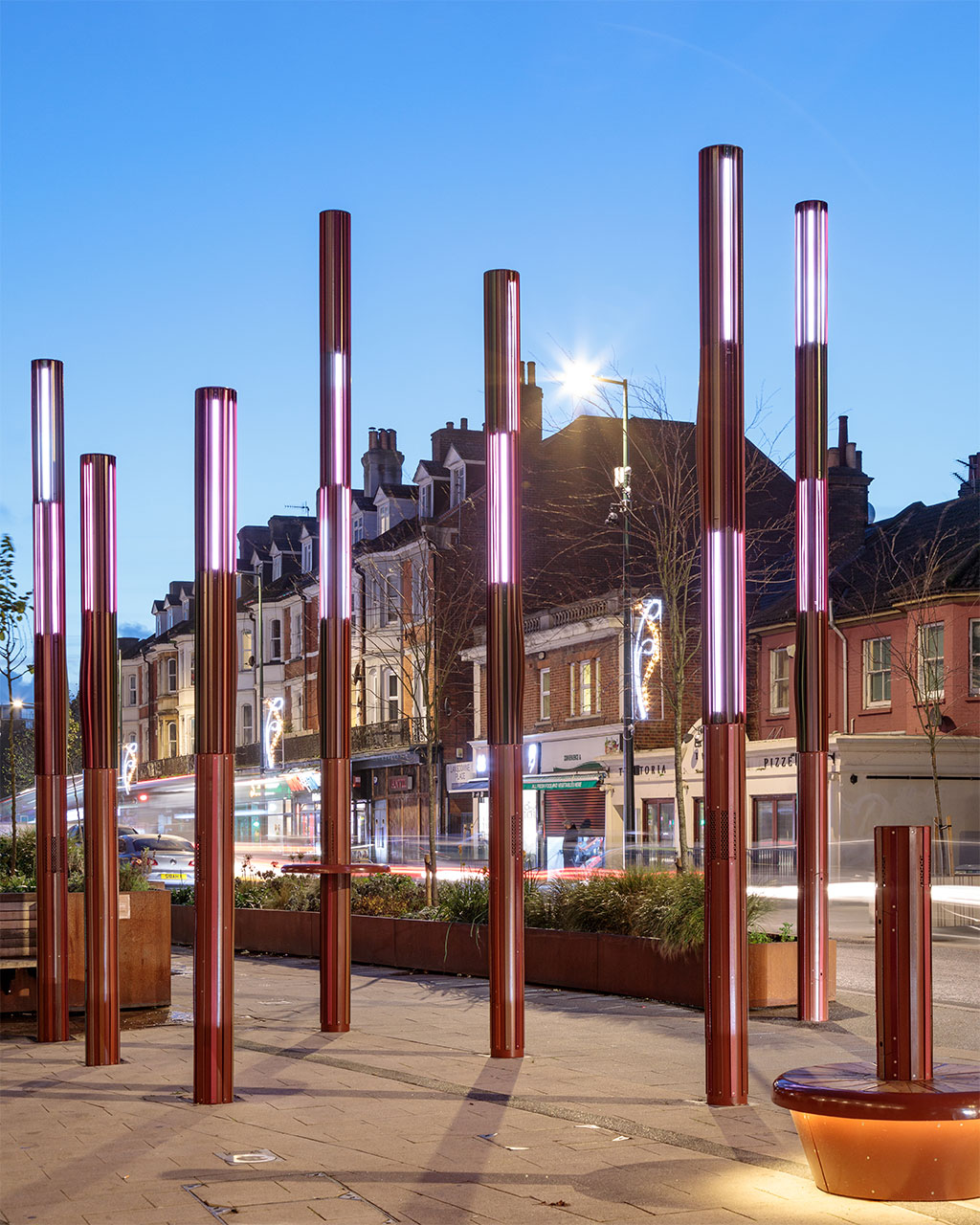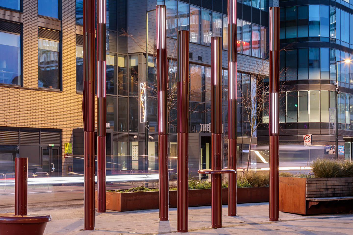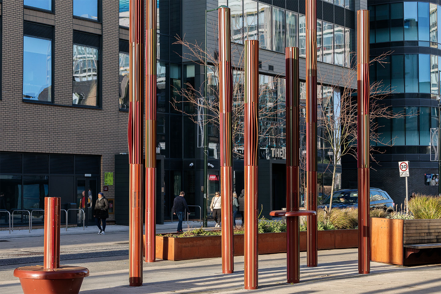 In totaal 17 stalen kolommen van verschillende hoogtes markeren het plein voor de Grade 2 geklasseerde brandweerkazerne. Ze verspreiden verlichting en geluid voor mensen die ontspannen op de bankjes op het plein of op doorreis zijn. Het licht en geluid in elke kolom zijn in verschillende richtingen gepositioneerd voor een echt boeiende zintuiglijke ervaring.