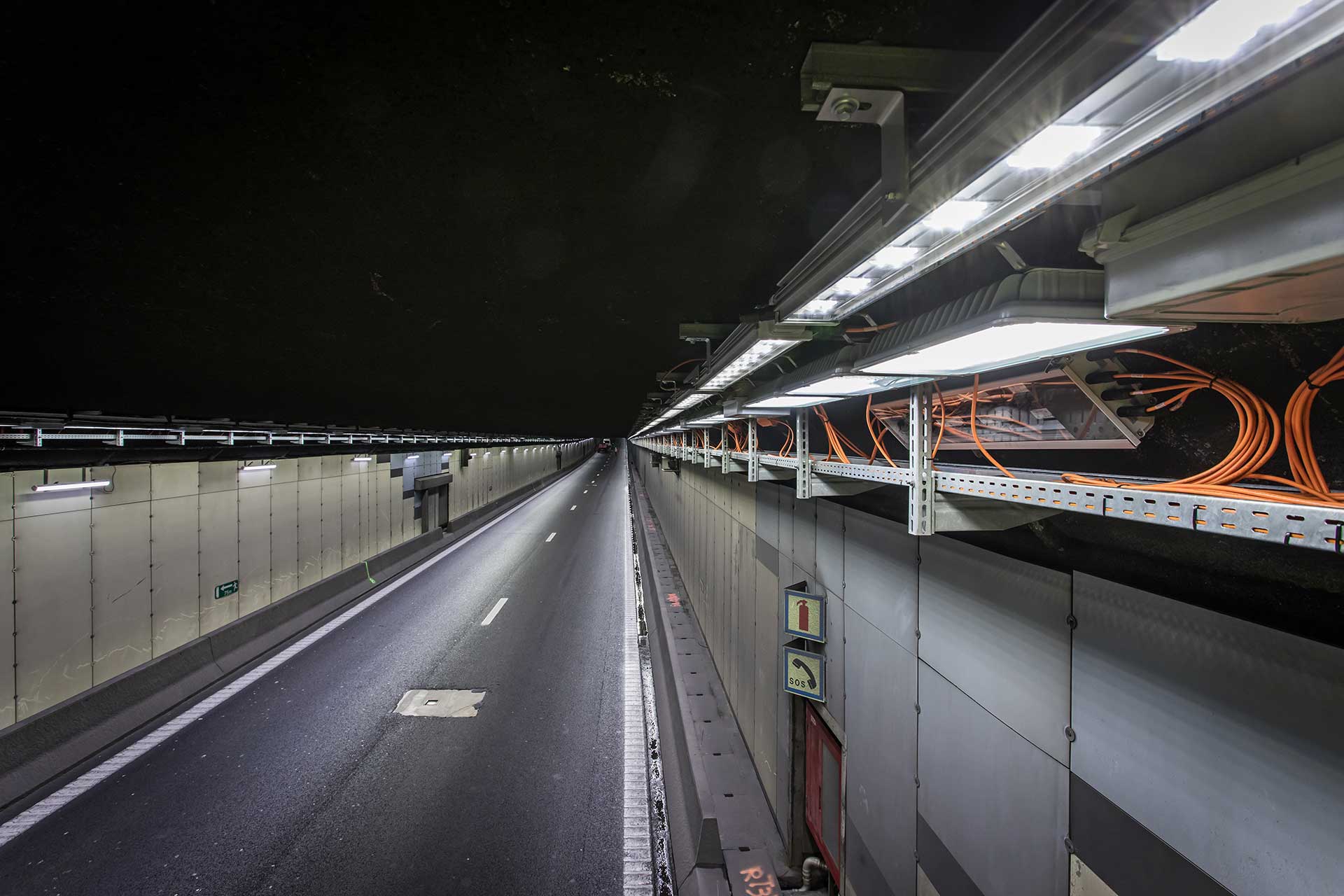 Door het lage plafond in deze tunnel konden de armaturen alleen aan de zijkant van de tunnelwand worden geïnstalleerd en zijn ze uitgerust met speciale lenzen om het licht op de weg te richten. Dit garandeert de vereiste lichtniveaus en helderheid in de tunnel met een minimaal energieverbruik.