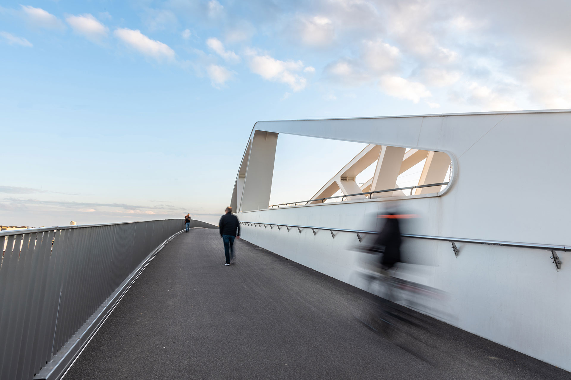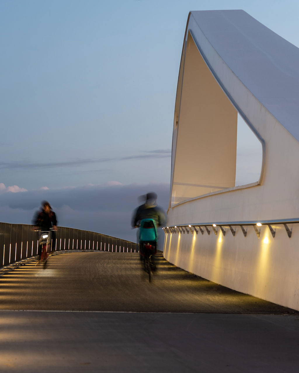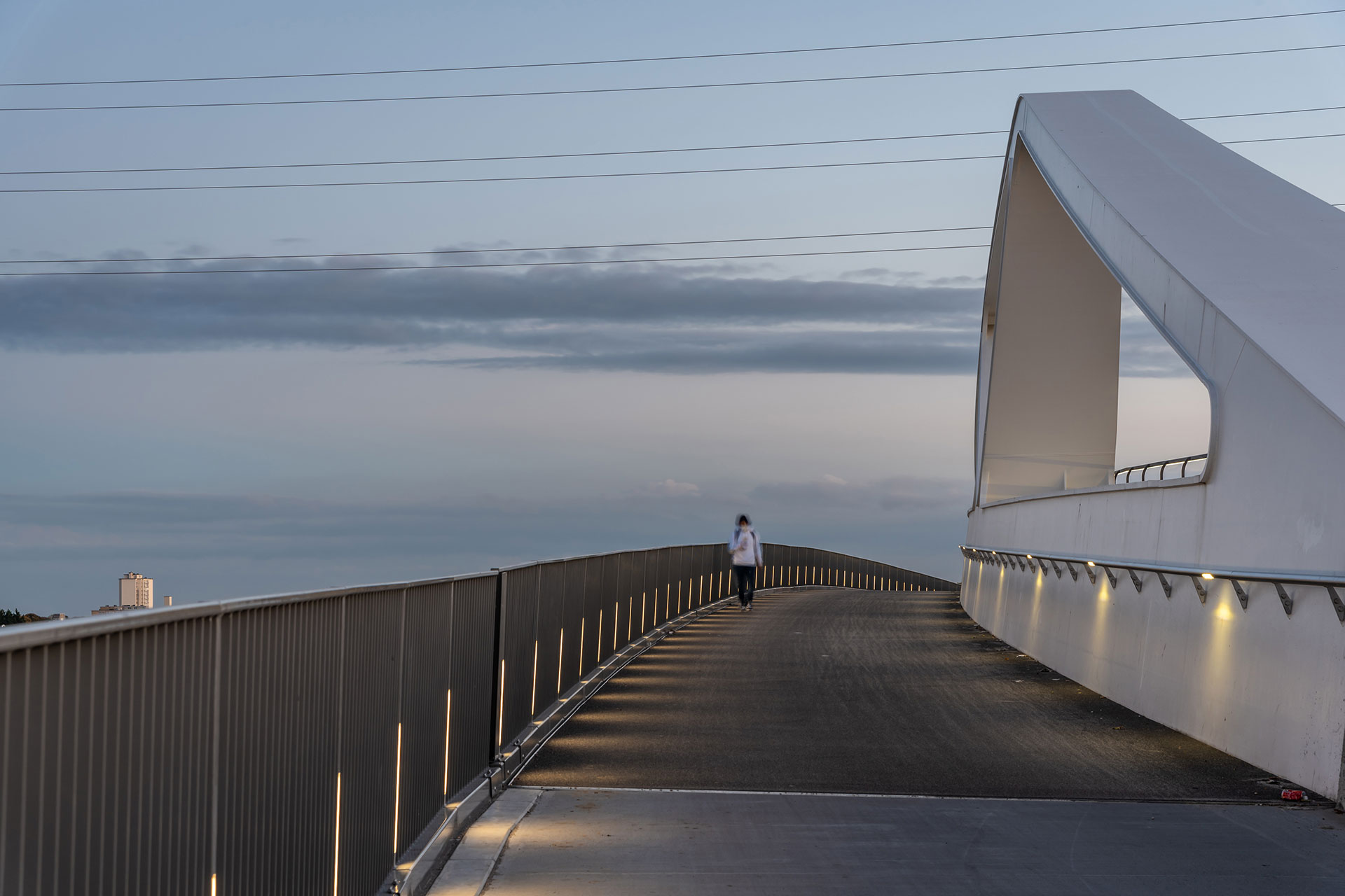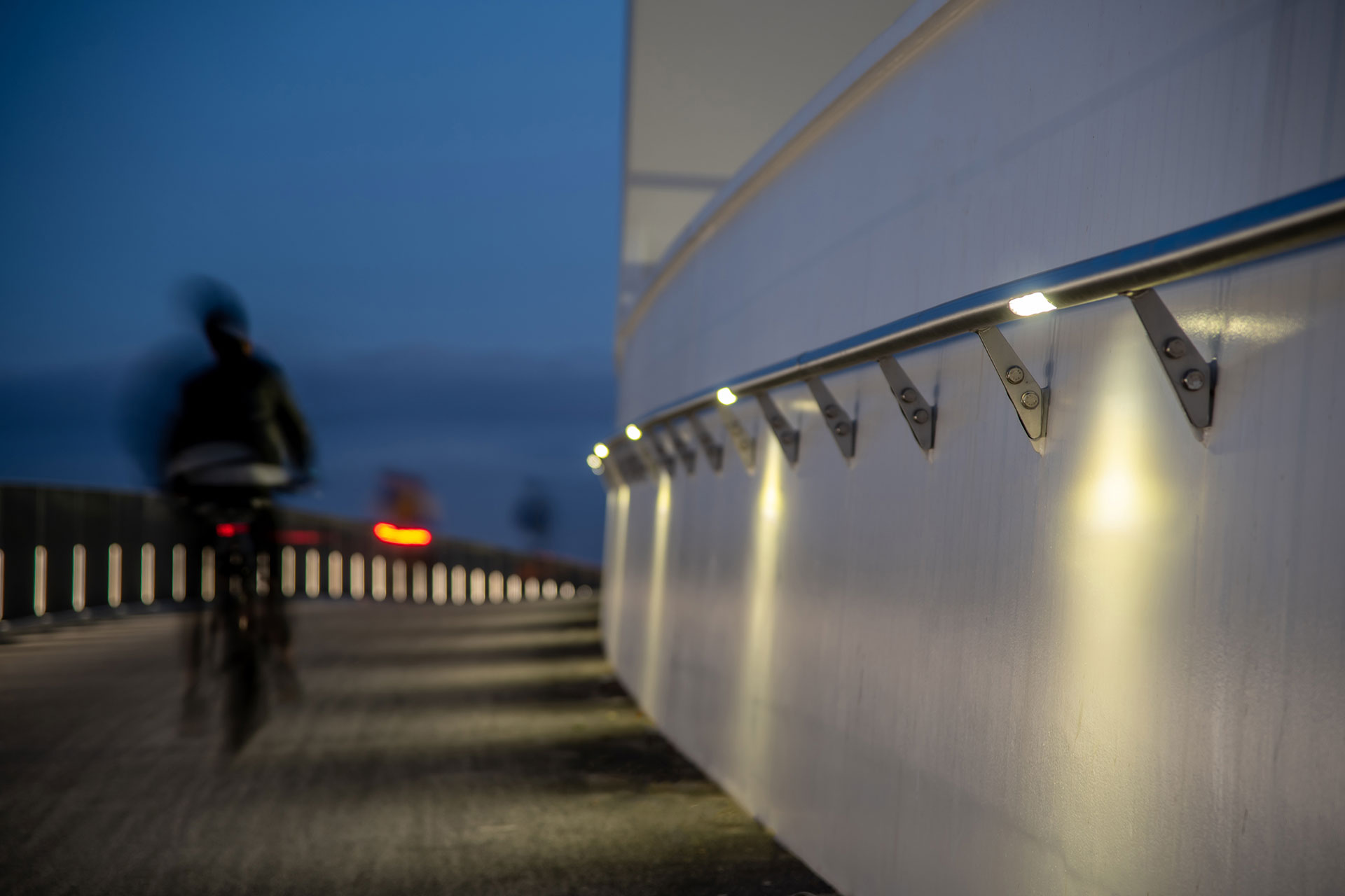 De robuuste en compacte ILUM MARK armaturen zijn verticaal in de reling van de brug ingebouwd en perfect in de structuur geïntegreerd. Ze zetten de architectuur in de schijnwerpers en zijn een gids voor de zachte weggebruikers (fietsers en voetgangers). Om de zichtbaarheid voor de voetgangers en fietsers te vergroten, werden er HANDRAIL’s in de leuning geïntegreerd. De armaturen met 3 high-power LEDs in neutraal wit verlichten de brug gelijkmatig en zorgen voor visueel comfort. Zo kunnen de gebruikers in alle veiligheid de brug oversteken.
