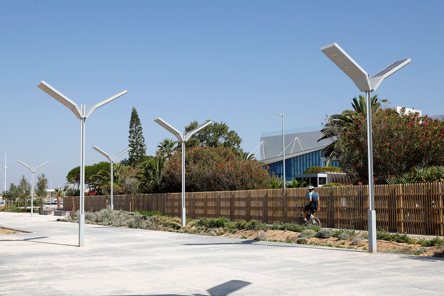 Het LINHA+ zonnepaneel verlicht de hele 1,2 km lange kustpromenade die de vissershaven van Quarteira met het zandstrand van Vilamoura verbindt. Het zorgt voor een recreatieve en vrijetijdsbestemming die inwoners en toeristen aanmoedigt om tussen de twee zeer populaire badplaatsen te wandelen of te fietsen en 24 uur per dag te genieten van het prachtige landschap. Ze kunnen ook stoppen en gebruik maken van de nieuwe faciliteiten om te sporten of gewoon te ontspannen op een bankje.